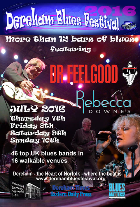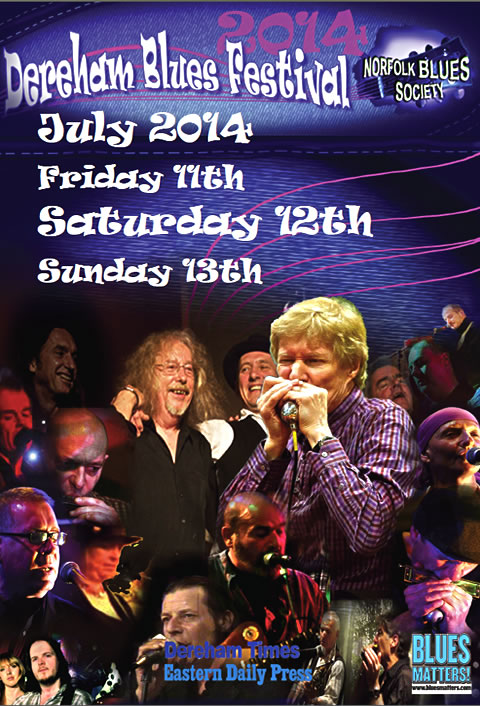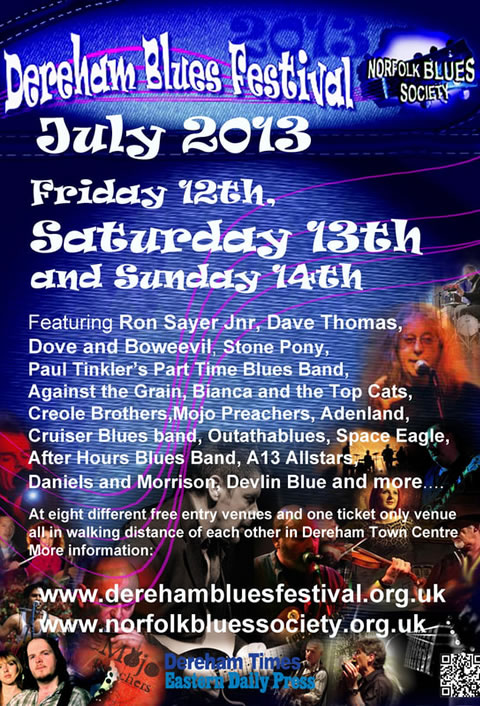 The Dereham Blues Festival, or DBF for short, was the brainchild of the Norfolk Blues Society after a member said, back in December 2012, "Wouldn't it be good if..." ... and so the first Dereham Blues Festival was born, coming to life in July 2013 with two headliners, Ron Sayer Jr and Dave Thomas and a variety of local, national and international bands.