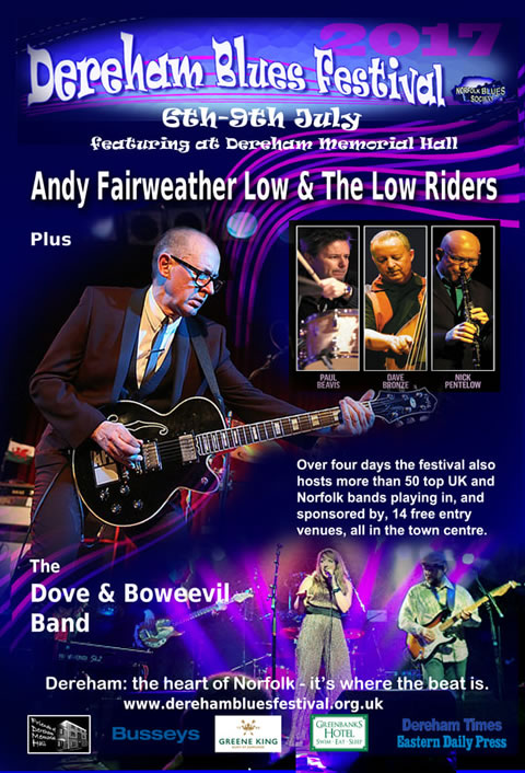 Organised by two of the Norfolk Blues Society's founding members Doreen and Stewart Aitken, the festival has gone from strength to strength and has quickly become a notable festival on the national blues scene. After yet another successful festival in 2015, it soon became apparent that in its three short years it has reached far beyond Norfolk and had gained national status and needed more than just two people to run it. So, in preparation for DBF 2016, a committee of volunteers was put together to help run it. Although still affiliated with the Norfolk Blues Society, the festival has become a company in its own right and is a registered not-for-profit company.