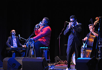 The 6th Annual Dereham Blues Festival was propelled to a superlative start in the Town’s Memorial Hall last night by the legendary Georgie Fame and The Family Trio. Making up the trio are Georgie’s sons Tristan on guitar with brother James playing drums and together they performed an enthralling show, documenting Georgie Fame’s career spanning nearly 60 years in the music business. Tunes from every decade, including of course all the hits (Yeh Yeh, Bonnie and Clyde) were set in context by the man himself with genial and illuminating anecdotes between the numbers. There were great songs by influential performers and writers like Booker T, Ray Charles, Mose Allison, Hoagy Carmichael, Floyd Dixon and Peggy Lee and even a spot of country with He’ll Have To Go – a nod to Jim Reeves via Ry Cooder.